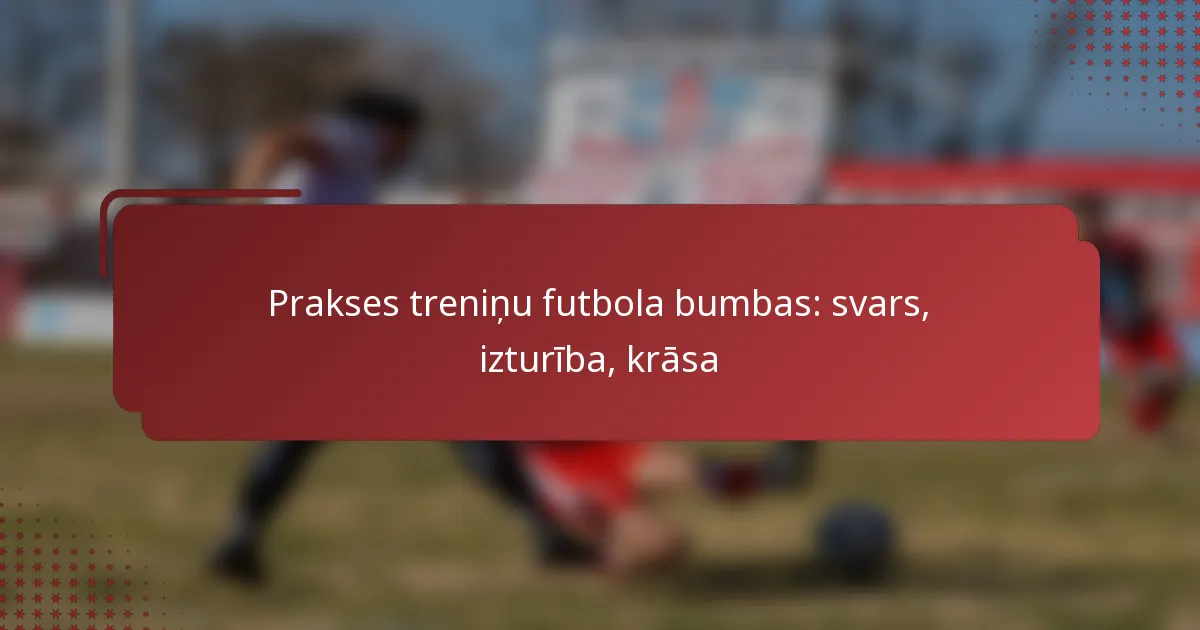 Treniņu futbola bumbas ir būtiski rīki spēlētājiem, kuri vēlas uzlabot savas prasmes, ar standarta svaru, kas svārstās no 350 līdz 450 gramiem, lai nodrošinātu līdzsvaru starp izturību un sniegumu. Šo bumbu kalpošanas ilgums atšķiras atkarībā no materiāliem un konstrukcijas, augstākas kvalitātes iespējas parasti piedāvā lielāku izturību intensīvas apmācības laikā. Turklāt futbola bumbas saķere, ko ietekmē tās virsmas tekstūra un materiāli, spēlē nozīmīgu lomu bumbas kontroles un kopējā snieguma uzlabošanā dažādos vingrinājumos.